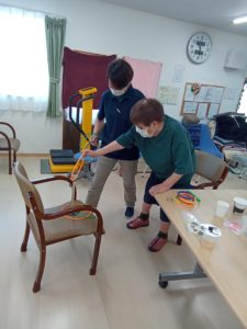 輪投げの輪を投げて入れるのではなく、前屈みになり棒に近づいて入れることで、重心移動やバランスの訓練になります🙌